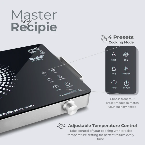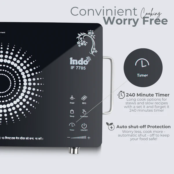 The Indo Infrared Cooktop 7705 brings cutting-edge technology to your kitchen, blending speed, safety, and versatility in one sleek package. Designed for health-conscious cooking, it emits no radiation, ensuring your meals are both delicious and safe. Thanks to its infrared technology, the cooktop provides instant, even heat, so you can whip up perfectly cooked dishes in record time. No need for special cookware—use your favorite pots and pans on the durable crystal glass surface, which heats up directly and is a breeze to clean. The smart auto shut-off feature and 240-minute timer give you the freedom to cook with confidence, knowing that your meal is in safe hands. The digital display and touch sensor controls make navigating your settings a cinch, while the anti-skid feet ensure stability during cooking. With four preset cooking modes, this cooktop is ready to handle any culinary challenge you throw its way. Transform your cooking experience with Indo—where safety meets innovation, and style meets performance.