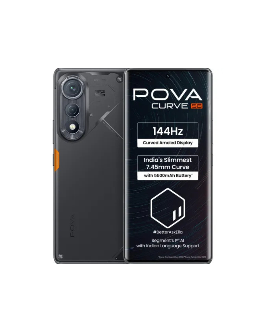 t the heart of our innovation lies the 3B vision Best Design,Best Signal,and Best AI a philosophy that powers our all-new Starship Design smartphone.Crafted for those who demand the extraordinary, it features a stunning 144Hz Curved AMOLED display encased in a n ultra-slim 7.45mm body, all while housing a massive 5500mAh battery proving that style and substance can truly coexist.Redefining connectivity, it offers No Network Communication,VoWiFi Dual Band, and the Intelligent Signal Hub System to ensure seamless communication even without cellular coverage delivering on our promise of the Best Signal.The experience is further elevated by BetteraskElla,a powerful AI assistant with support for Indian languages like Hindi, Marathi, Bengali, Tamil,and Gujarati,representing our commitment to Best AI AI that truly understands you. Powering it all is the D7300 Ultimate 5G Processor, with up to 16GB RAM (Memory Fusion) and 256GB ROM,ensuring smooth performance, while TUV SUD certification guarantees 72 months of lag-free experience. With a 64MP Sony IMX682 rear camera, 13MP front camera, IP64 rating,45W fast charger included,and Dolby Atmos audio, the Pova Curve 5G isnt just another smartphone it a leap forward,bringing our 3B vision to life.